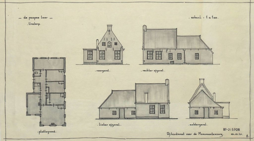 De ‘schat uit het archief’ gaat deze keer over de tekeningen gemaakt in 1961 door de ‘Rijksdienst voor Monumentenzorg’ van een bijzonder pand en de historie daarvan. Paapsche Leer, ook wel bekend als de Paapse Leere, Paepsche Leere of Paapse Leer, stond in Ureterp aan de Vaart zuidzijde 2, nabij het Ureterper Verlaat, tussen de Paapsche Leerewijk en de Haukewijk. Op oudere kaarten van omstreeks 1800 staat bij de plek aangegeven ‘Roomsche Leer’. Bij het huis hoorde een stuk greideland, genaamd de “Paapsche Leere-kamp”. De naam spreekt nog steeds tot de verbeelding. In de wijde omgeving kende men het pand.